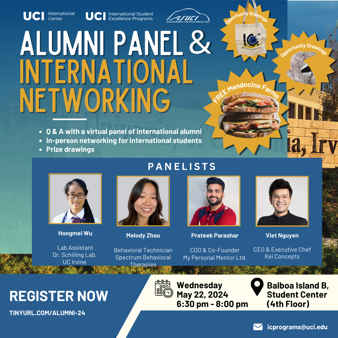 Join International Student Advocacy Commission for the Alumni Panel and International Networking event! In this hybrid event, you can get to connect with international alumni working in different fields, where you can ask questions for panelists via Zoom and network in person with your international peers~! 🗓 Wednesday, May 22, 2024 ⏰ 6:30 PM – 8:00 PM 📍 Balboa Island B, Student Center (4th Floor) RSVP now at TinyURL.com/Alumni-24. Food catering is provided by Mendocino Farms.