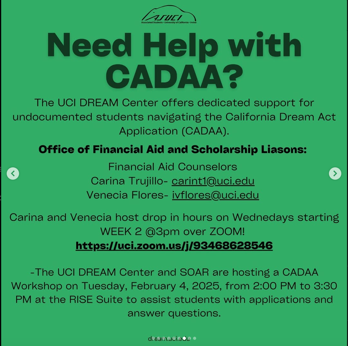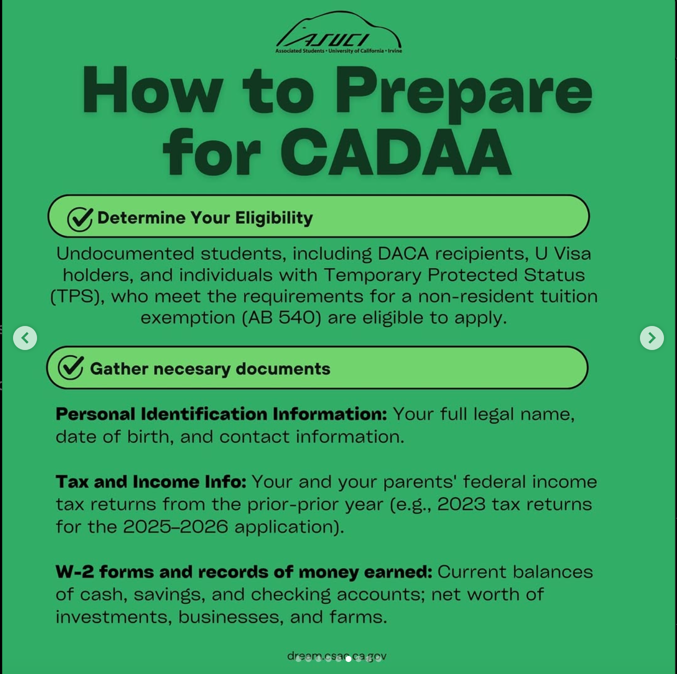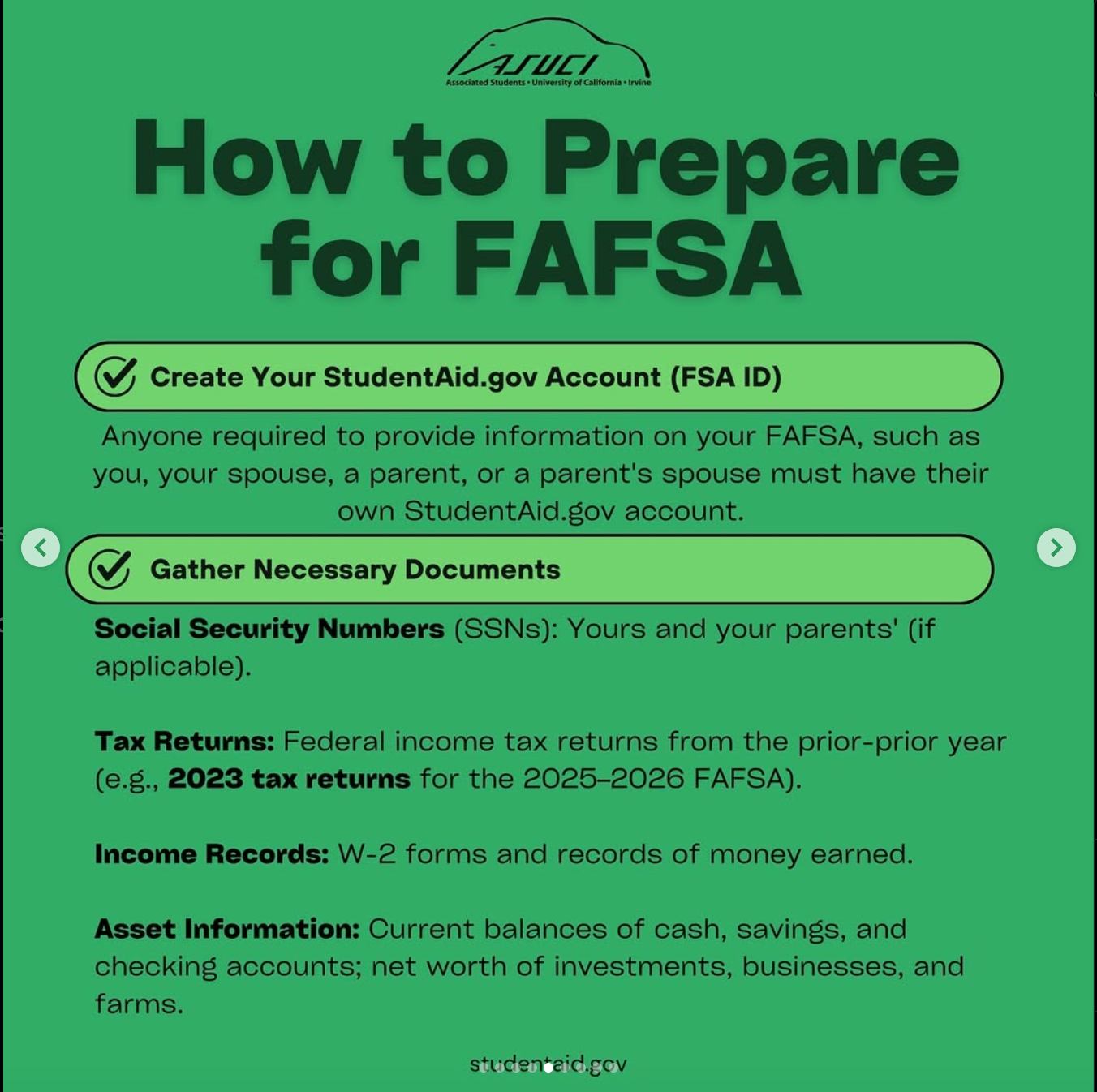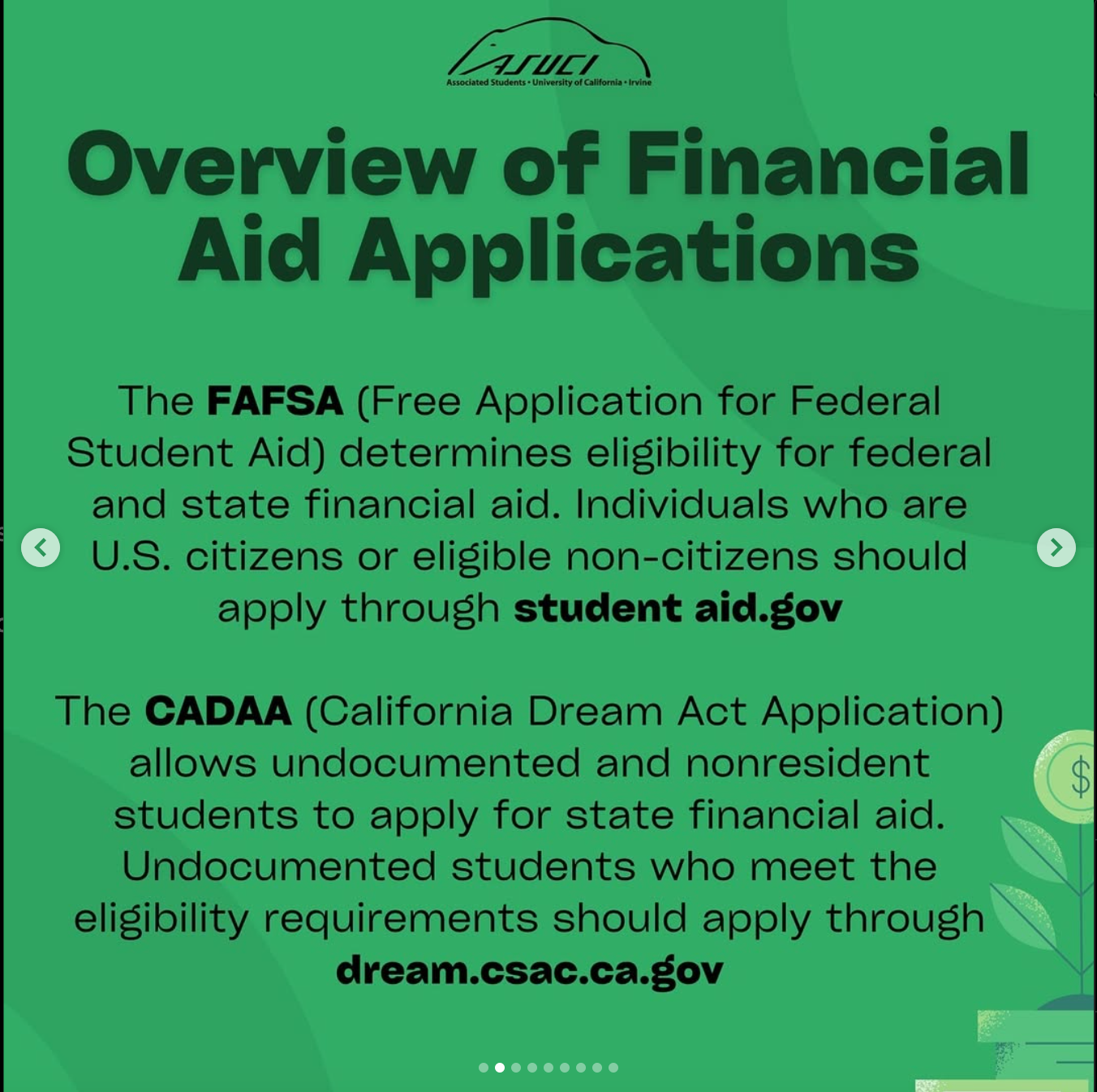 ASUCI’s Financial Wellness Commission has put together this guide to help YOU understand the qualifications, documents, and details that FAFSA and CADAA require.