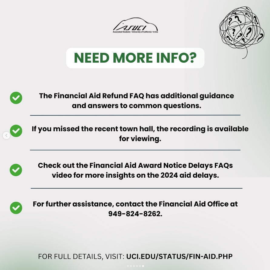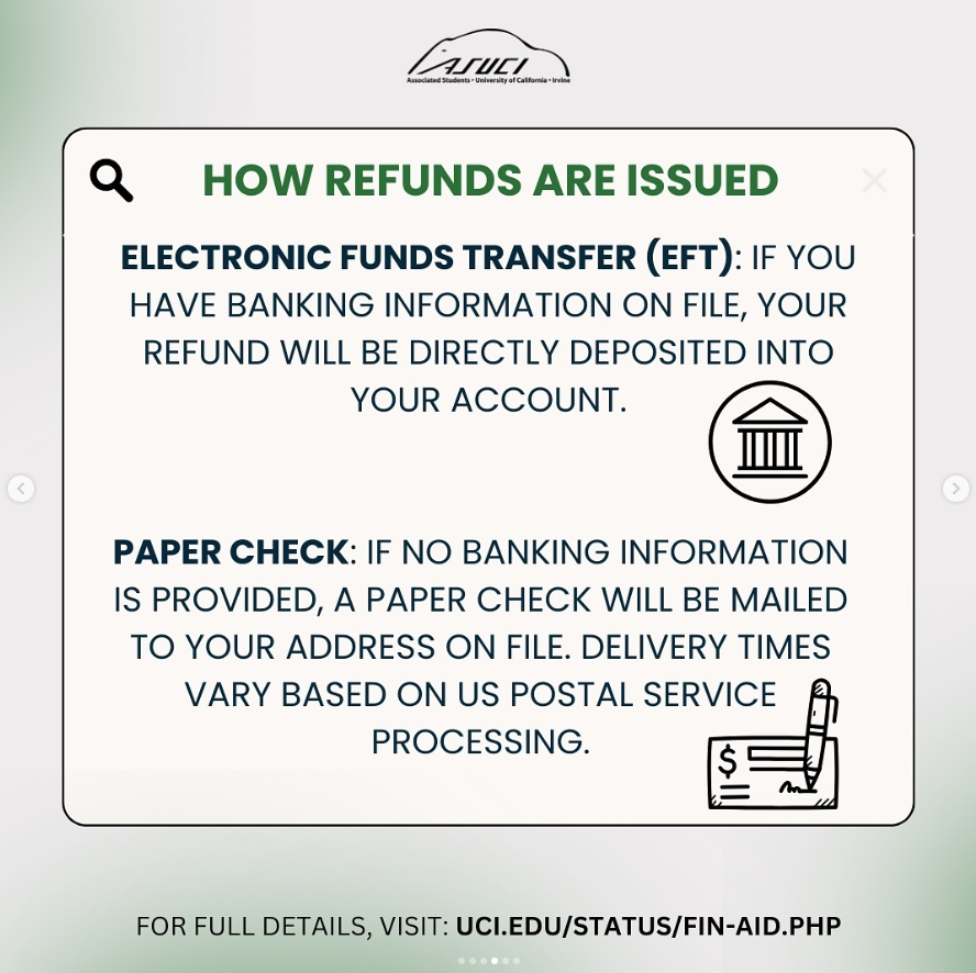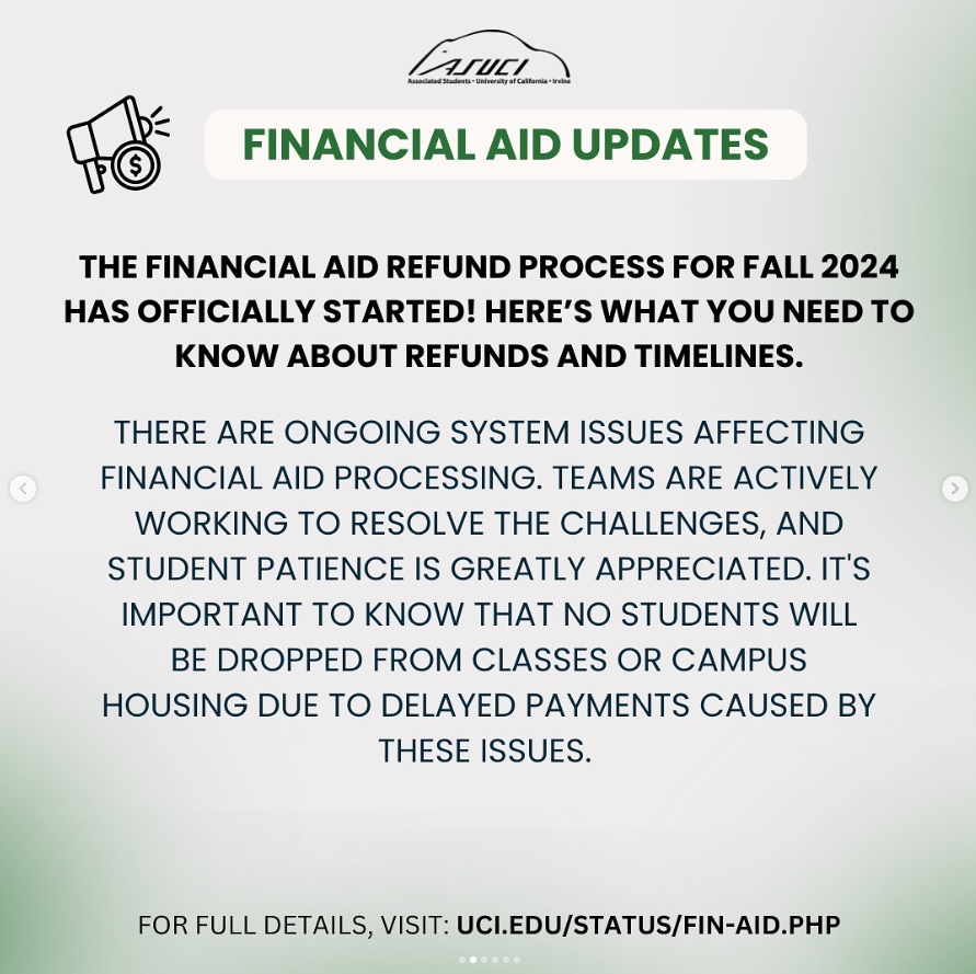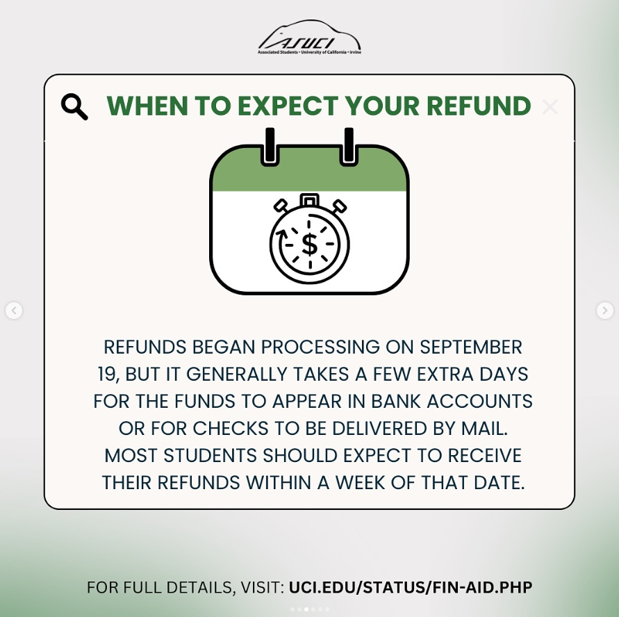 We know many of you are waiting for important updates regarding your financial aid refunds for Fall 2024. The UCI Office of Financial Aid & Scholarships (OFAS) recently started processing refunds, and we’re here to break down the key details you need to know!