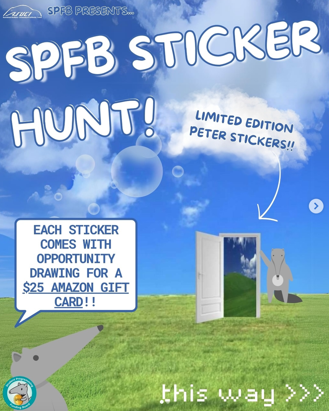 SPFB Sticker Hunt SPFB – SPFB Sticker Hunt Calling all sticker hunters 🔭👀 This Thursday, ASUCI’s Student Programming Funding Board is releasing some EXCLUSIVE stickers. Supply is LIMITED, so be there quick 🏃💨 President Chief of Staff2025-05-27T16:21:36-07:00